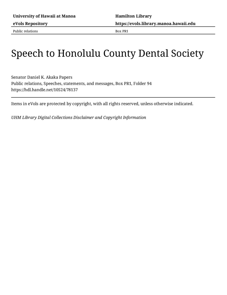 Speech to Honolulu County Dental Society, April 17, 1979, MANUSCRIPT-HCPC00010, Public relations, Speeches, statements, and messages, Box PR1, Folder 94, Senator Daniel K. Akaka Papers, Hawaiʻi Congressional Papers Collection, University of Hawaiʻi at Mānoa Library, Honolulu, HI. https://omekas-congress.lib.wvu.edu/catalog/10524_78137 (accessed April 20, 2026).