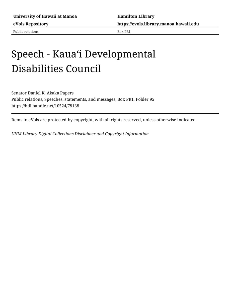 Speech - Kauaʻi Developmental Disabilities Council, April 21, 1979, MANUSCRIPT-HCPC00010, Public relations, Speeches, statements, and messages, Box PR1, Folder 95, Senator Daniel K. Akaka Papers, Hawaiʻi Congressional Papers Collection, University of Hawaiʻi at Mānoa Library, Honolulu, HI. https://omekas-congress.lib.wvu.edu/catalog/10524_78138 (accessed April 19, 2026).