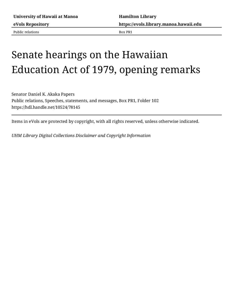 - Senate hearings on the Hawaiian Education Act of 1979, opening remarks