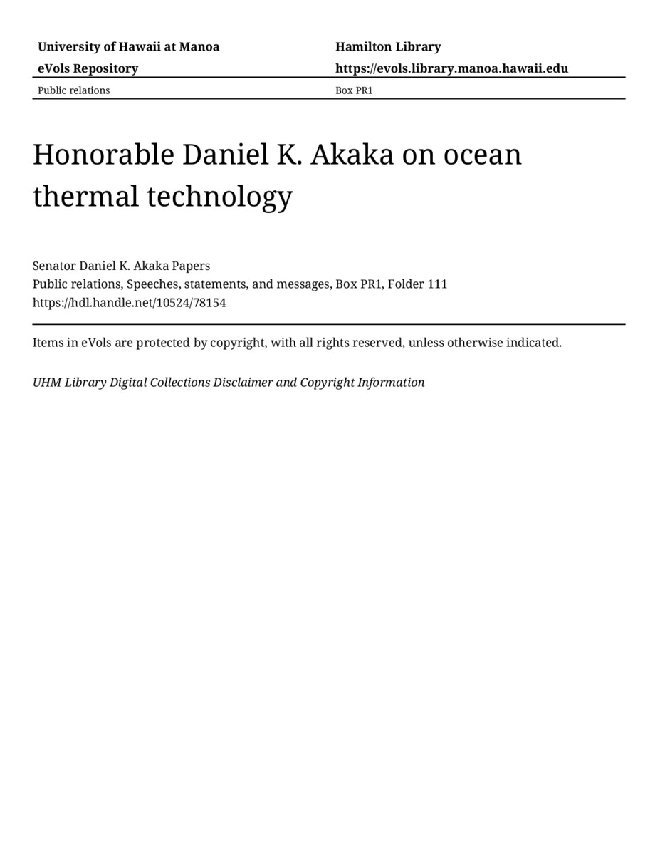 Honorable Daniel K. Akaka on ocean thermal technology, June 28, 1979, MANUSCRIPT-HCPC00010, Public relations, Speeches, statements, and messages, Box PR1, Folder 111, Senator Daniel K. Akaka Papers, Hawaiʻi Congressional Papers Collection, University of Hawaiʻi at Mānoa Library, Honolulu, HI. https://omekas-congress.lib.wvu.edu/catalog/10524_78154 (accessed April 14, 2026).