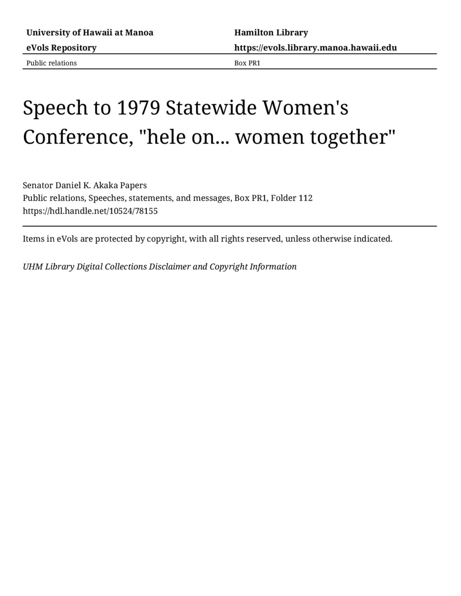 - Speech to 1979 Statewide Women's Conference, "hele on... women together"