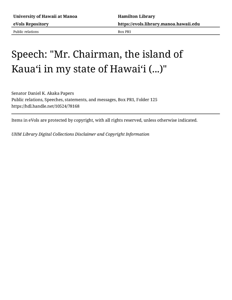 - Speech: "Mr. Chairman, the island of Kauaʻi in my state of Hawaiʻi (...)"