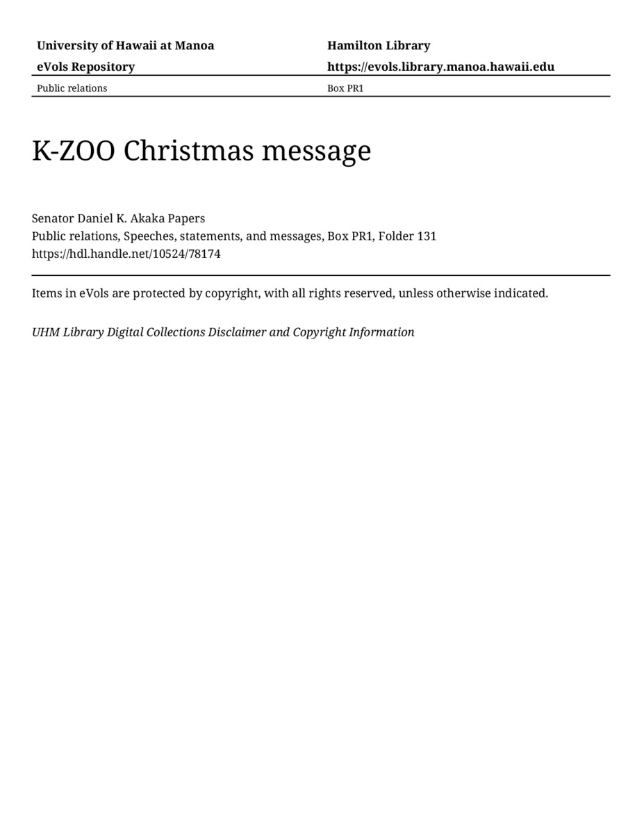 K-ZOO Christmas message, approximately December 25, 1979, MANUSCRIPT-HCPC00010, Public relations, Speeches, statements, and messages, Box PR1, Folder 131, Senator Daniel K. Akaka Papers, Hawaiʻi Congressional Papers Collection, University of Hawaiʻi at Mānoa Library, Honolulu, HI. https://omekas-congress.lib.wvu.edu/catalog/10524_78174 (accessed April 14, 2026).