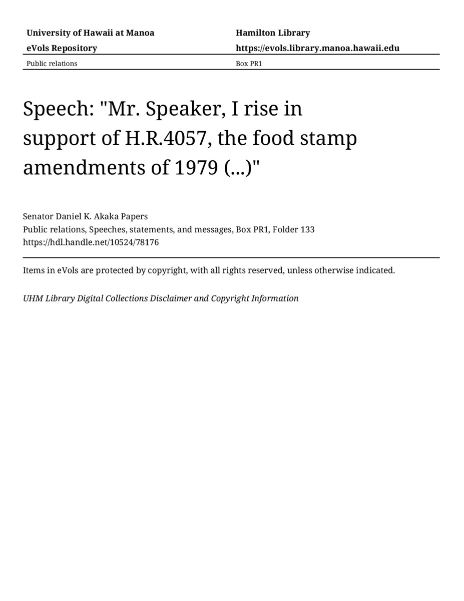 - Speech: "Mr. Speaker, I rise in support of H.R.4057, the food stamp amendments of 1979 (...)"