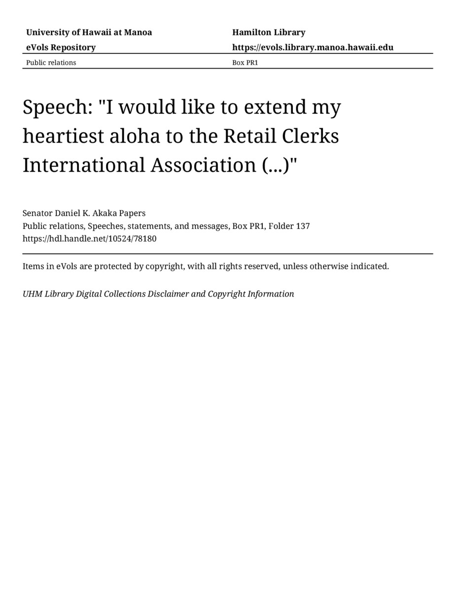 Speech: "I would like to extend my heartiest aloha to the Retail Clerks International Association (...)", approximately 1979-1980, MANUSCRIPT-HCPC00010, Public relations, Speeches, statements, and messages, Box PR1, Folder 137, Senator Daniel K. Akaka Papers, Hawaiʻi Congressional Papers Collection, University of Hawaiʻi at Mānoa Library, Honolulu, HI. https://omekas-congress.lib.wvu.edu/catalog/10524_78180 (accessed April 14, 2026).
