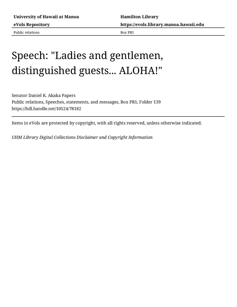 Speech: "Ladies and gentlemen, distinguished guests... ALOHA!", approximately 1979-1980, MANUSCRIPT-HCPC00010, Public relations, Speeches, statements, and messages, Box PR1, Folder 139, Senator Daniel K. Akaka Papers, Hawaiʻi Congressional Papers Collection, University of Hawaiʻi at Mānoa Library, Honolulu, HI. https://omekas-congress.lib.wvu.edu/catalog/10524_78182 (accessed April 14, 2026).