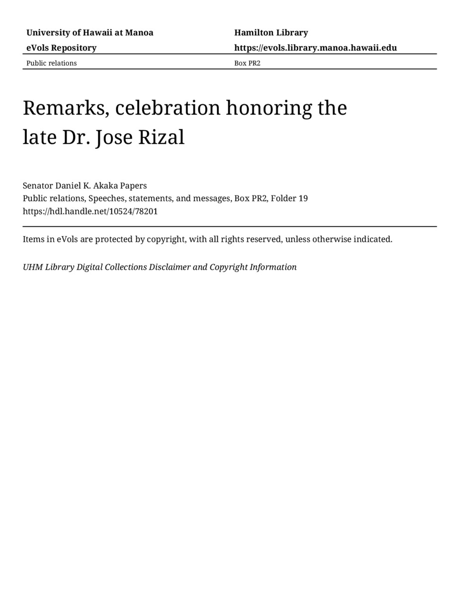 Remarks, celebration honoring the late Dr. Jose Rizal, June 20, 1980, MANUSCRIPT-HCPC00010, Public relations, Speeches, statements, and messages, Box PR2, Folder 19, Senator Daniel K. Akaka Papers, Hawaiʻi Congressional Papers Collection, University of Hawaiʻi at Mānoa Library, Honolulu, HI. https://omekas-congress.lib.wvu.edu/catalog/10524_78201 (accessed April 15, 2026).