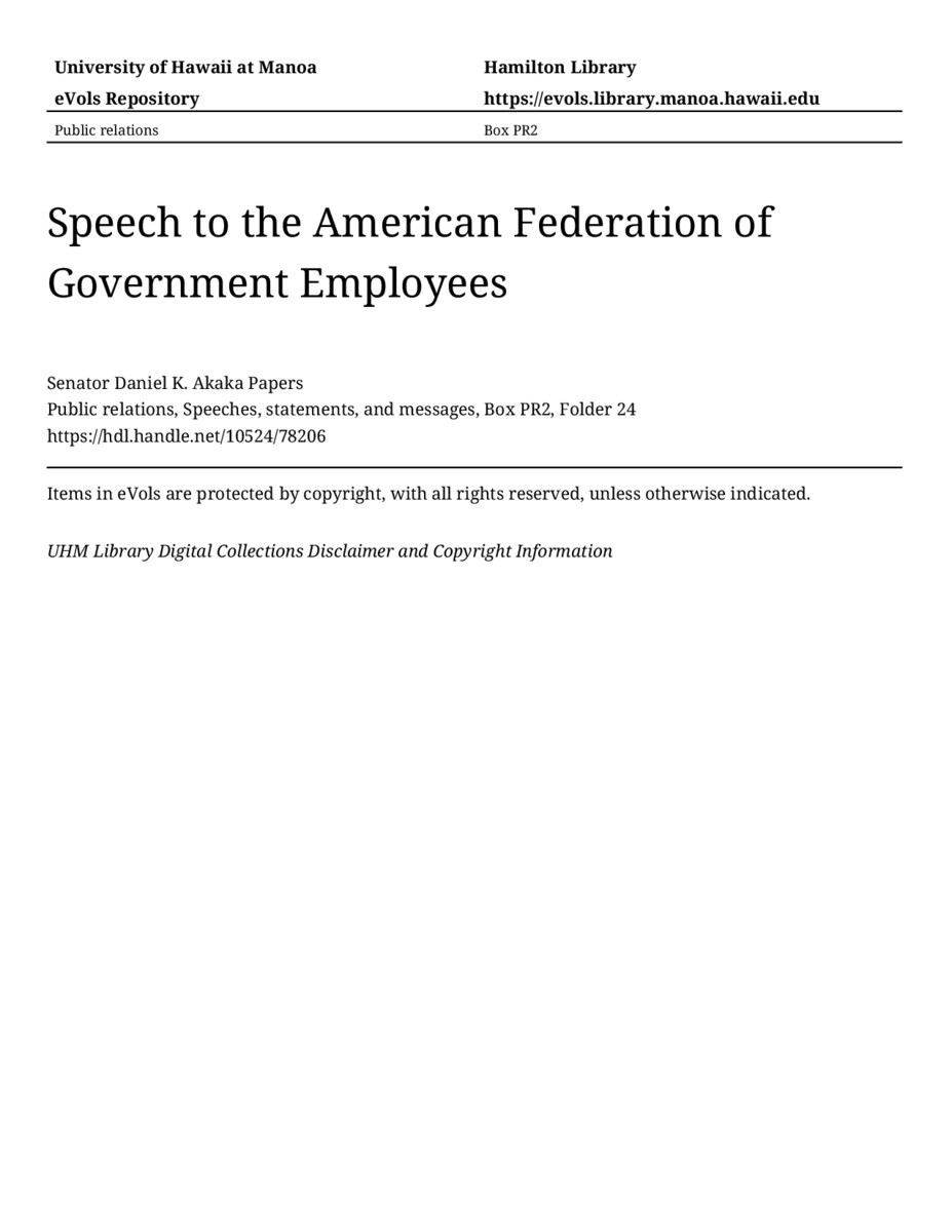 Speech to the American Federation of Government Employees, August 29, 1980, MANUSCRIPT-HCPC00010, Public relations, Speeches, statements, and messages, Box PR2, Folder 24, Senator Daniel K. Akaka Papers, Hawaiʻi Congressional Papers Collection, University of Hawaiʻi at Mānoa Library, Honolulu, HI. https://omekas-congress.lib.wvu.edu/catalog/10524_78206 (accessed April 17, 2026).