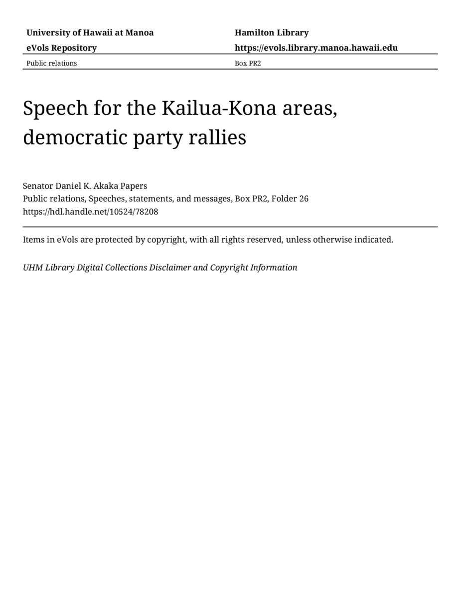 Speech for the Kailua-Kona areas, democratic party rallies, August 30, 1980, MANUSCRIPT-HCPC00010, Public relations, Speeches, statements, and messages, Box PR2, Folder 26, Senator Daniel K. Akaka Papers, Hawaiʻi Congressional Papers Collection, University of Hawaiʻi at Mānoa Library, Honolulu, HI. https://omekas-congress.lib.wvu.edu/catalog/10524_78208 (accessed April 19, 2026).