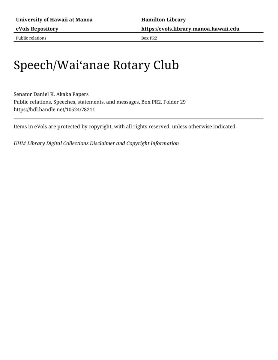 Speech/Waiʻanae Rotary Club, October 7, 1980, MANUSCRIPT-HCPC00010, Public relations, Speeches, statements, and messages, Box PR2, Folder 29, Senator Daniel K. Akaka Papers, Hawaiʻi Congressional Papers Collection, University of Hawaiʻi at Mānoa Library, Honolulu, HI. https://omekas-congress.lib.wvu.edu/catalog/10524_78211 (accessed April 17, 2026).