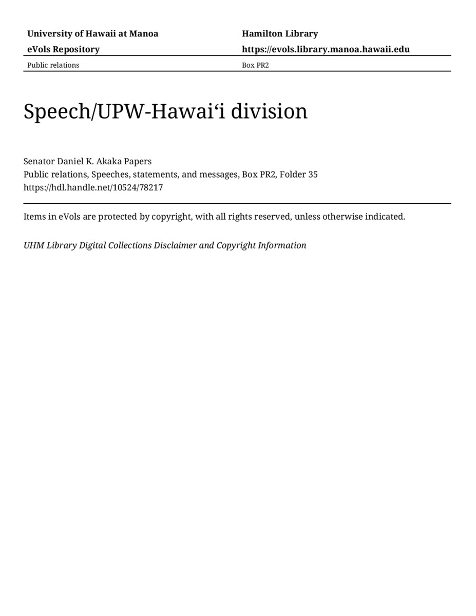 Speech/UPW-Hawaiʻi division, October 24, 1980, MANUSCRIPT-HCPC00010, Public relations, Speeches, statements, and messages, Box PR2, Folder 35, Senator Daniel K. Akaka Papers, Hawaiʻi Congressional Papers Collection, University of Hawaiʻi at Mānoa Library, Honolulu, HI. https://omekas-congress.lib.wvu.edu/catalog/10524_78217 (accessed April 17, 2026).