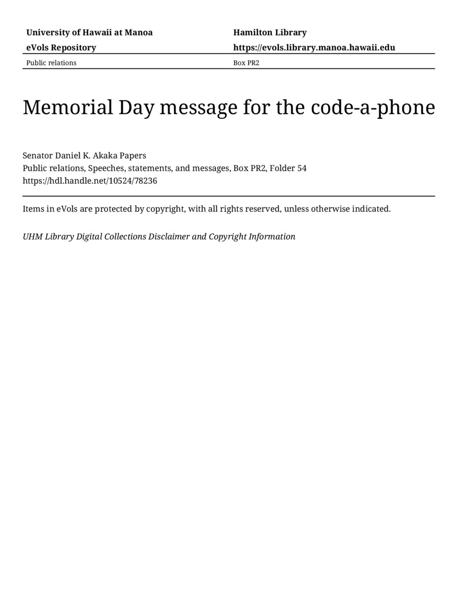 Memorial Day message for the code-a-phone, May 1, 1981, MANUSCRIPT-HCPC00010, Public relations, Speeches, statements, and messages, Box PR2, Folder 54, Senator Daniel K. Akaka Papers, Hawaiʻi Congressional Papers Collection, University of Hawaiʻi at Mānoa Library, Honolulu, HI. https://omekas-congress.lib.wvu.edu/catalog/10524_78236 (accessed April 17, 2026).