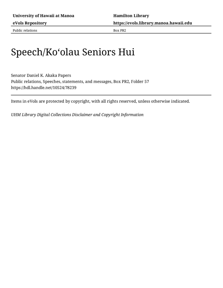 Speech/Koʻolau Seniors Hui, August 13, 1981, MANUSCRIPT-HCPC00010, Public relations, Speeches, statements, and messages, Box PR2, Folder 57, Senator Daniel K. Akaka Papers, Hawaiʻi Congressional Papers Collection, University of Hawaiʻi at Mānoa Library, Honolulu, HI. https://omekas-congress.lib.wvu.edu/catalog/10524_78239 (accessed April 17, 2026).