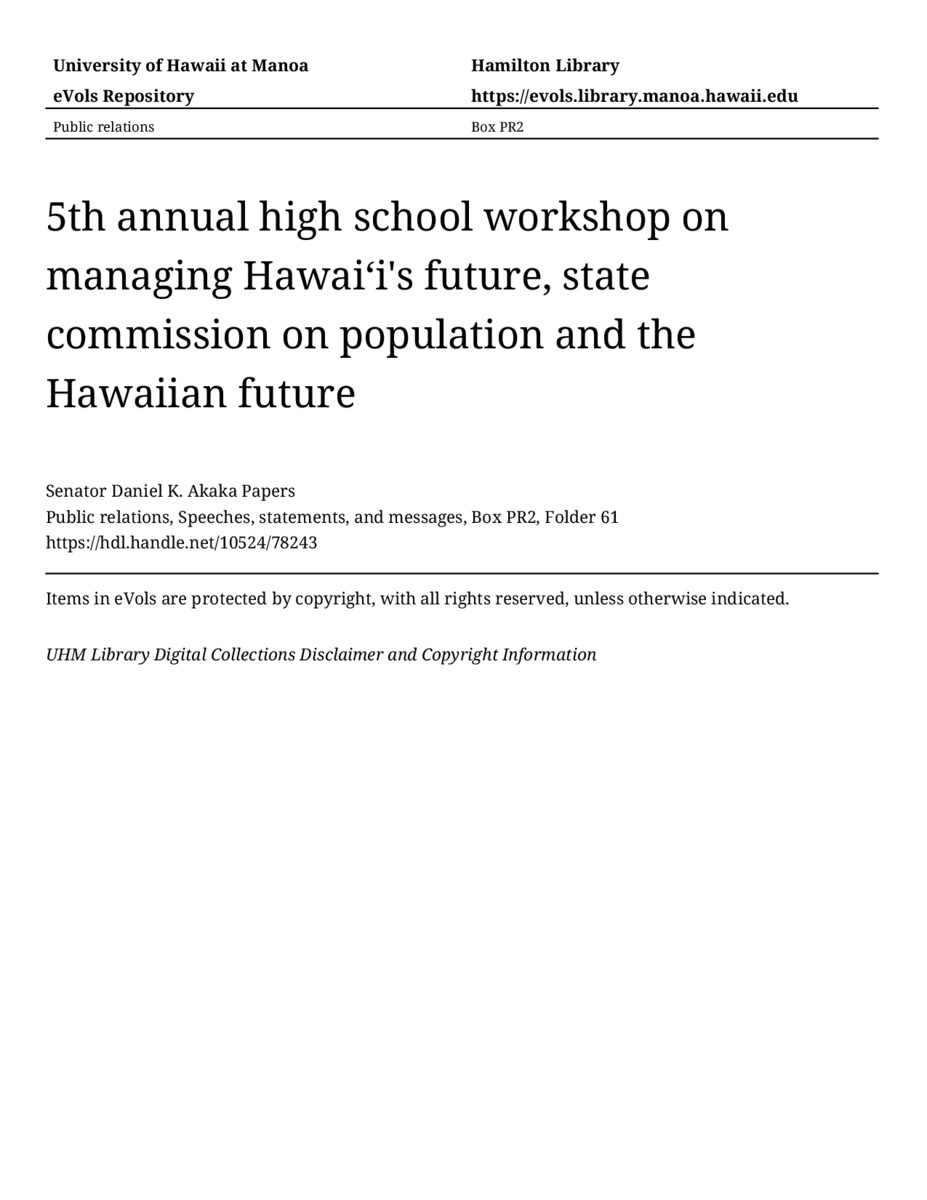 5th annual high school workshop on managing Hawaiʻi's future, state commission on population and the Hawaiian future, October 24, 1981, MANUSCRIPT-HCPC00010, Public relations, Speeches, statements, and messages, Box PR2, Folder 61, Senator Daniel K. Akaka Papers, Hawaiʻi Congressional Papers Collection, University of Hawaiʻi at Mānoa Library, Honolulu, HI. https://omekas-congress.lib.wvu.edu/catalog/10524_78243 (accessed April 17, 2026).