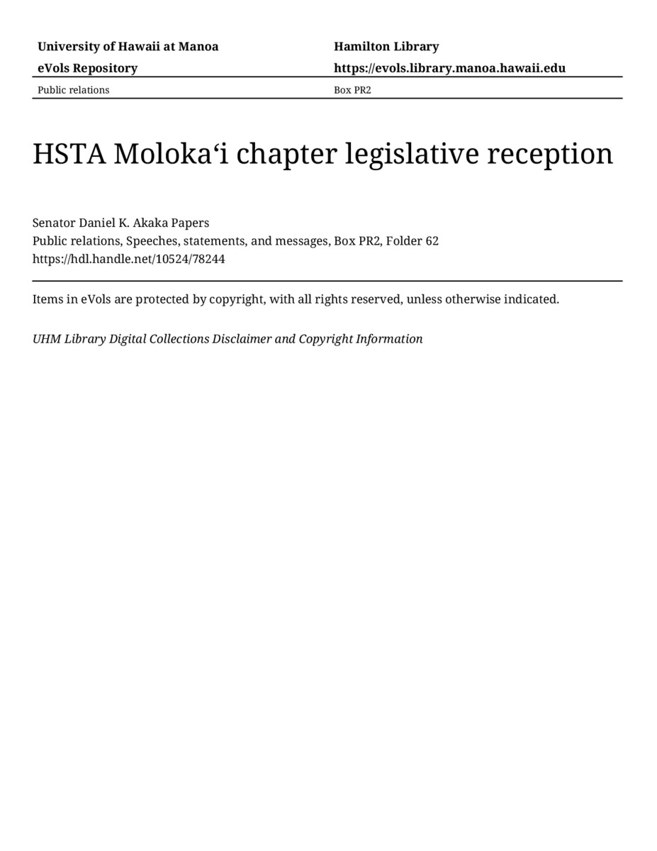 HSTA Molokaʻi chapter legislative reception, December 3, 1981, MANUSCRIPT-HCPC00010, Public relations, Speeches, statements, and messages, Box PR2, Folder 62, Senator Daniel K. Akaka Papers, Hawaiʻi Congressional Papers Collection, University of Hawaiʻi at Mānoa Library, Honolulu, HI. https://omekas-congress.lib.wvu.edu/catalog/10524_78244 (accessed April 17, 2026).