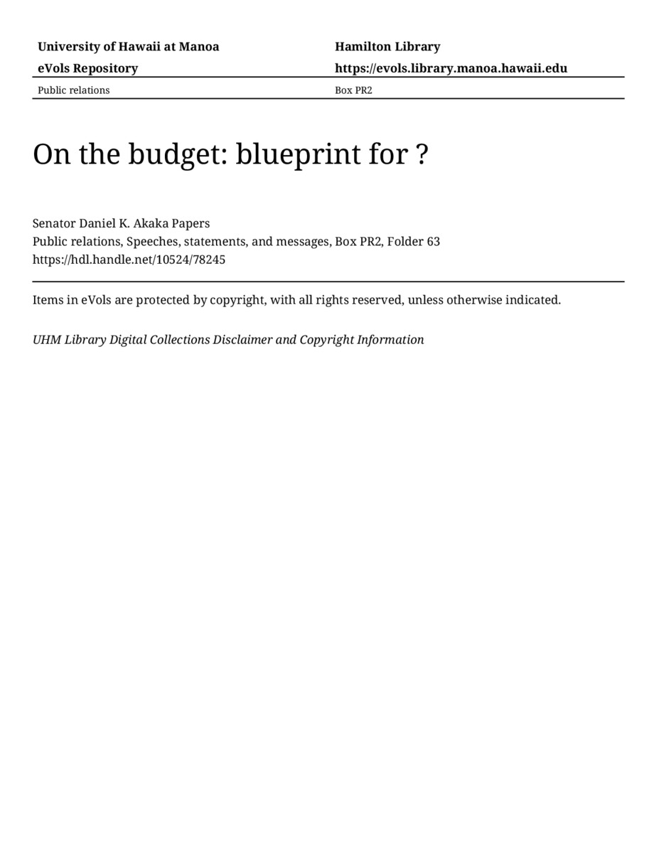On the budget: blueprint for ?, December 1, 1981, MANUSCRIPT-HCPC00010, Public relations, Speeches, statements, and messages, Box PR2, Folder 63, Senator Daniel K. Akaka Papers, Hawaiʻi Congressional Papers Collection, University of Hawaiʻi at Mānoa Library, Honolulu, HI. https://omekas-congress.lib.wvu.edu/catalog/10524_78245 (accessed April 19, 2026).
