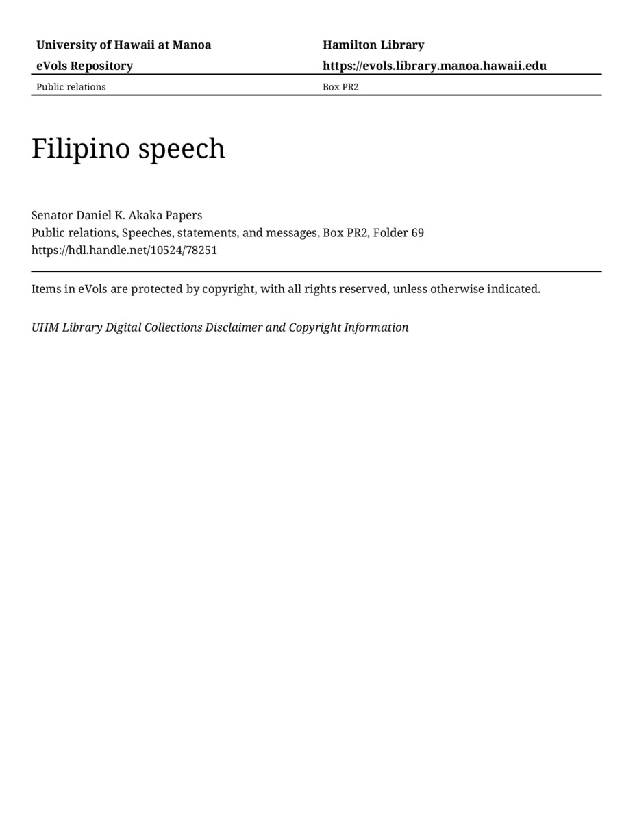 Filipino speech, approximately 1982, MANUSCRIPT-HCPC00010, Public relations, Speeches, statements, and messages, Box PR2, Folder 69, Senator Daniel K. Akaka Papers, Hawaiʻi Congressional Papers Collection, University of Hawaiʻi at Mānoa Library, Honolulu, HI. https://omekas-congress.lib.wvu.edu/catalog/10524_78251 (accessed April 17, 2026).