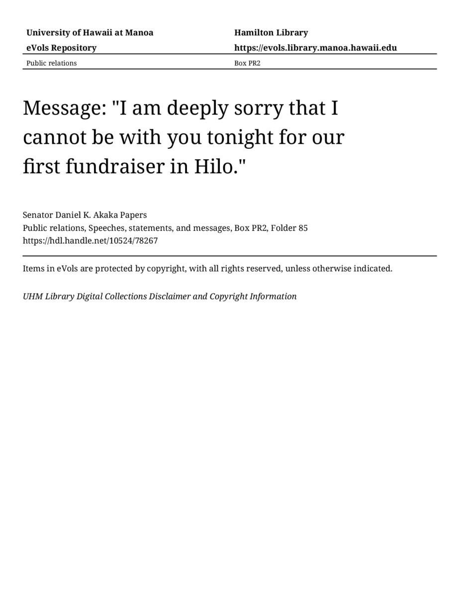 Message: "I am deeply sorry that I cannot be with you tonight for our first fundraiser in Hilo."