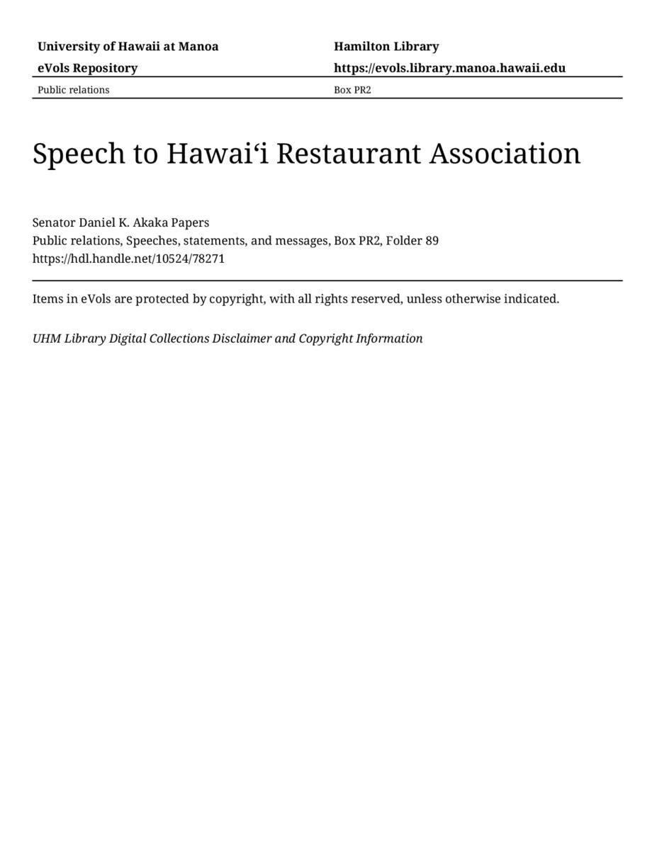 Speech to Hawaiʻi Restaurant Association, September 2, 1982, MANUSCRIPT-HCPC00010, Public relations, Speeches, statements, and messages, Box PR2, Folder 89, Senator Daniel K. Akaka Papers, Hawaiʻi Congressional Papers Collection, University of Hawaiʻi at Mānoa Library, Honolulu, HI. https://omekas-congress.lib.wvu.edu/catalog/10524_78271 (accessed April 10, 2026).