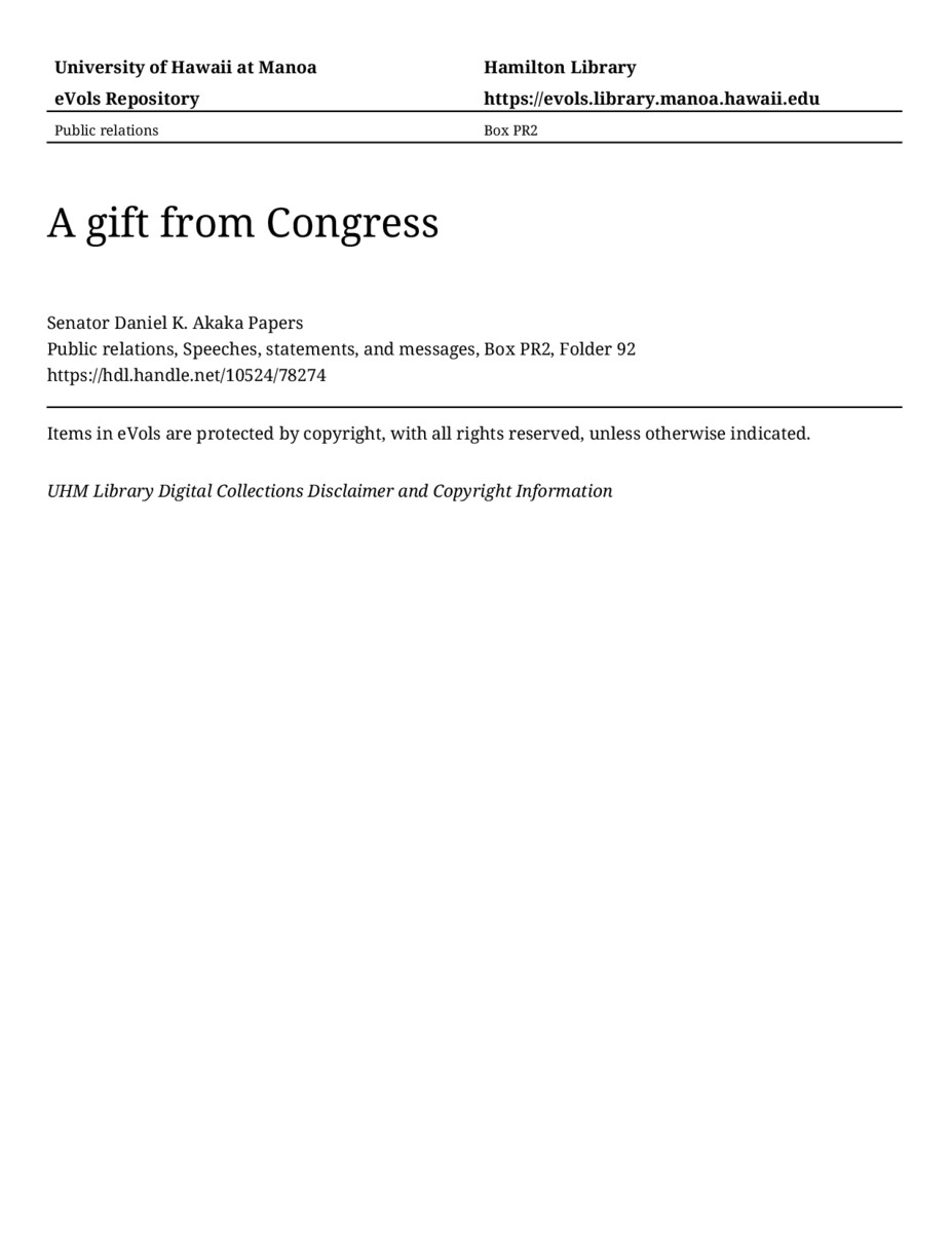 A gift from Congress, approximately 1982, MANUSCRIPT-HCPC00010, Public relations, Speeches, statements, and messages, Box PR2, Folder 92, Senator Daniel K. Akaka Papers, Hawaiʻi Congressional Papers Collection, University of Hawaiʻi at Mānoa Library, Honolulu, HI. https://omekas-congress.lib.wvu.edu/catalog/10524_78274 (accessed April 13, 2026).