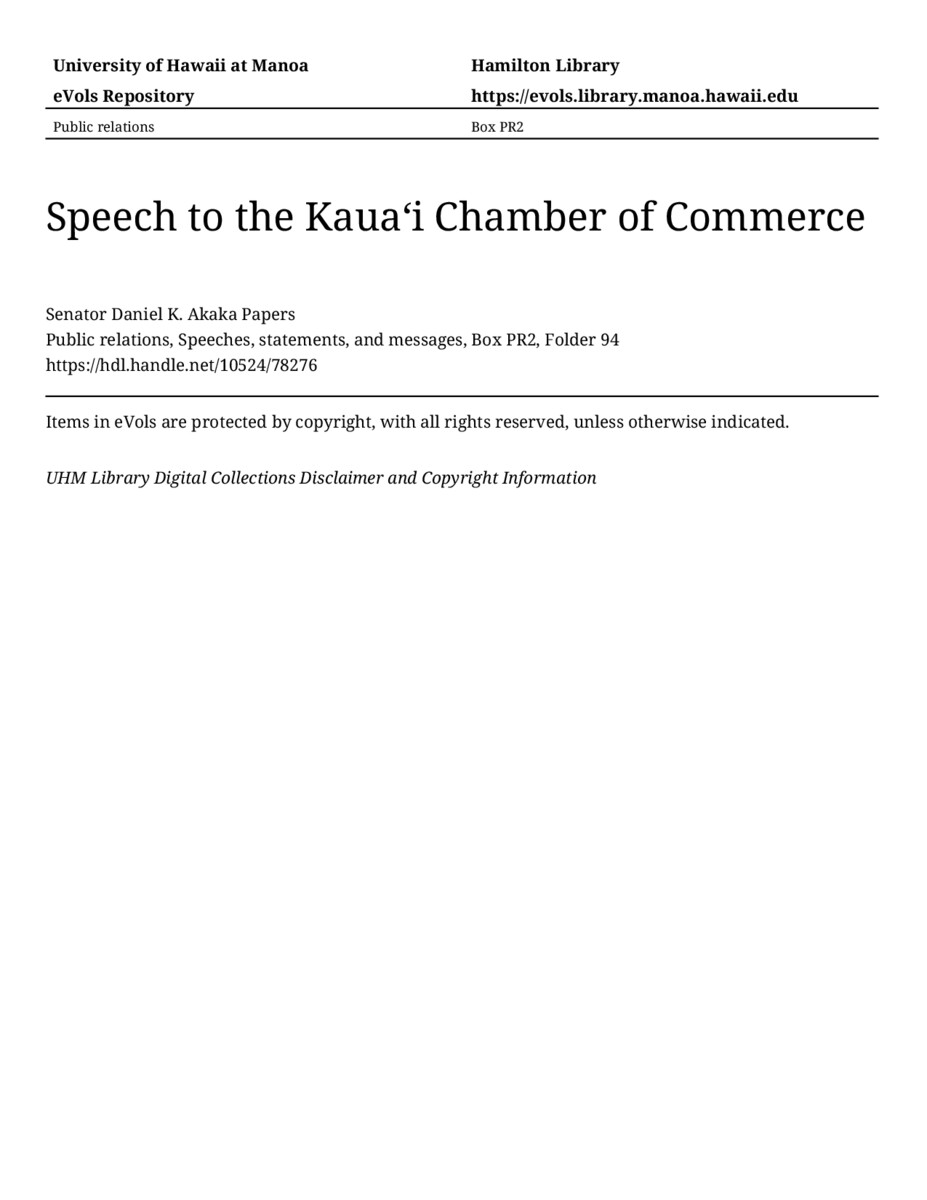 Speech to the Kauaʻi Chamber of Commerce, January 18, 1983, MANUSCRIPT-HCPC00010, Public relations, Speeches, statements, and messages, Box PR2, Folder 94, Senator Daniel K. Akaka Papers, Hawaiʻi Congressional Papers Collection, University of Hawaiʻi at Mānoa Library, Honolulu, HI. https://omekas-congress.lib.wvu.edu/catalog/10524_78276 (accessed April 23, 2026).