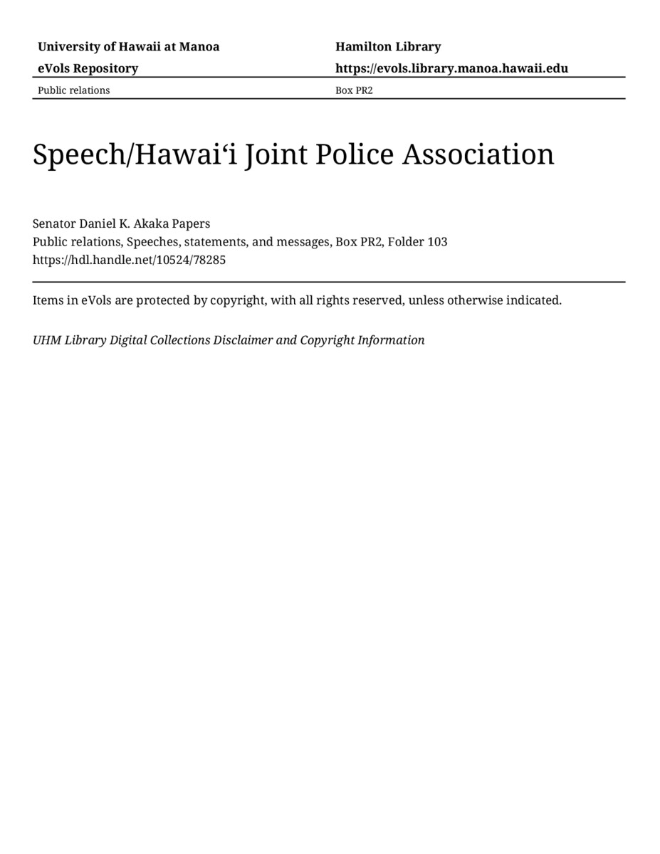 Speech/Hawaiʻi Joint Police Association, May 27, 1983, MANUSCRIPT-HCPC00010, Public relations, Speeches, statements, and messages, Box PR2, Folder 103, Senator Daniel K. Akaka Papers, Hawaiʻi Congressional Papers Collection, University of Hawaiʻi at Mānoa Library, Honolulu, HI. https://omekas-congress.lib.wvu.edu/catalog/10524_78285 (accessed April 19, 2026).