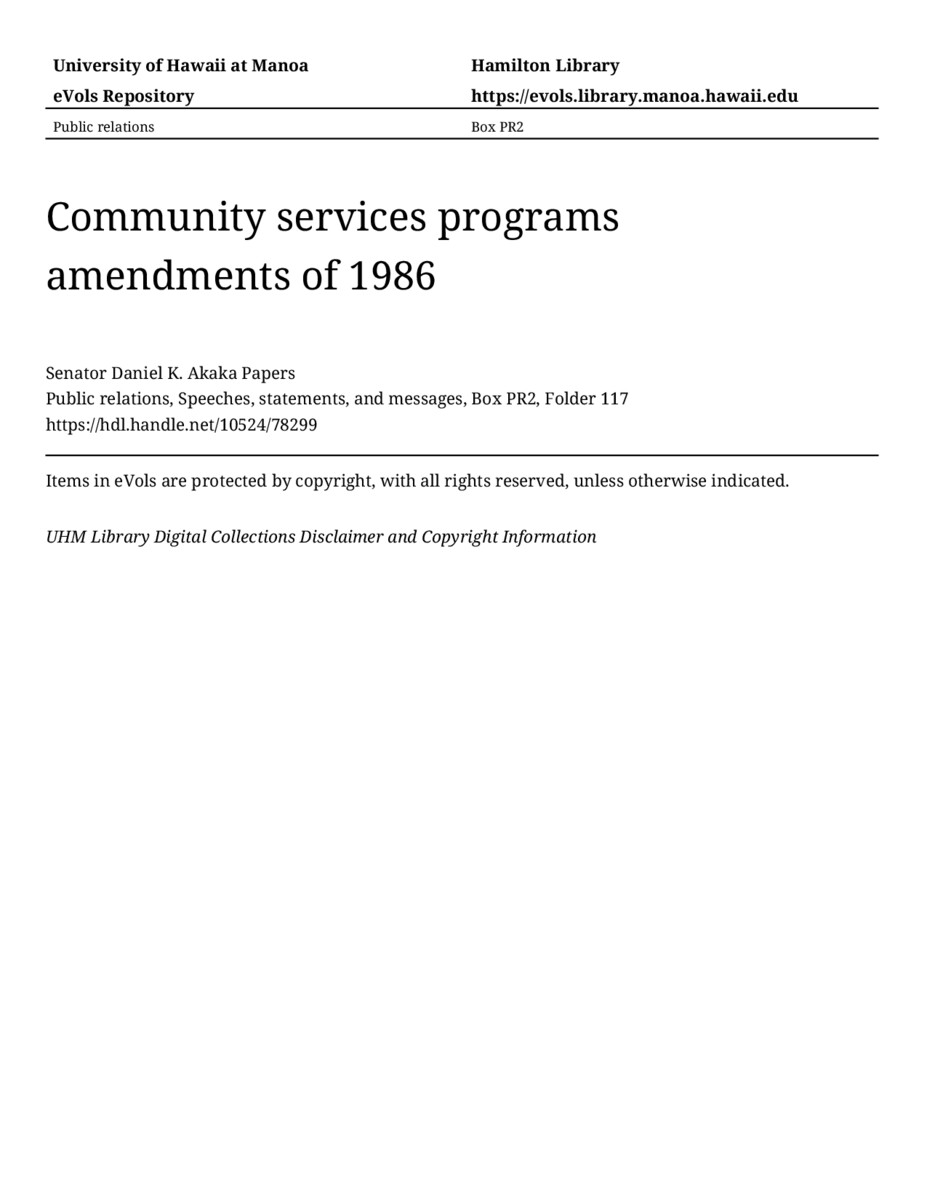 Community services programs amendments of 1986, April 29, 1986, MANUSCRIPT-HCPC00010, Public relations, Speeches, statements, and messages, Box PR2, Folder 117, Senator Daniel K. Akaka Papers, Hawaiʻi Congressional Papers Collection, University of Hawaiʻi at Mānoa Library, Honolulu, HI. https://omekas-congress.lib.wvu.edu/catalog/10524_78299 (accessed April 15, 2026).