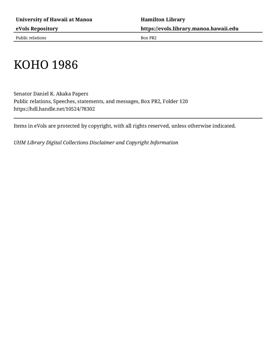 KOHO 1986, approximately December 1986, MANUSCRIPT-HCPC00010, Public relations, Speeches, statements, and messages, Box PR2, Folder 120, Senator Daniel K. Akaka Papers, Hawaiʻi Congressional Papers Collection, University of Hawaiʻi at Mānoa Library, Honolulu, HI. https://omekas-congress.lib.wvu.edu/catalog/10524_78302 (accessed April 20, 2026).