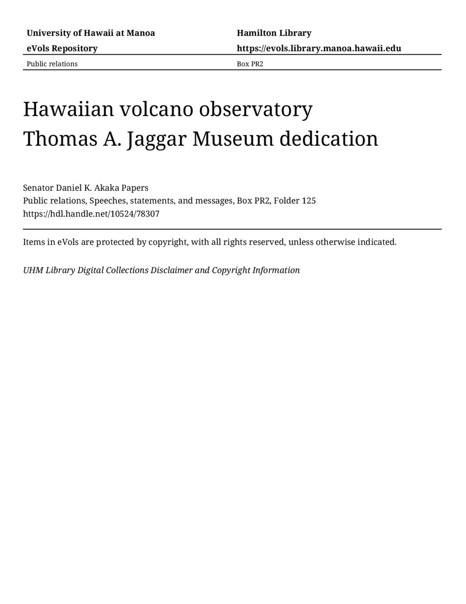 - Hawaiian volcano observatory Thomas A. Jaggar Museum dedication