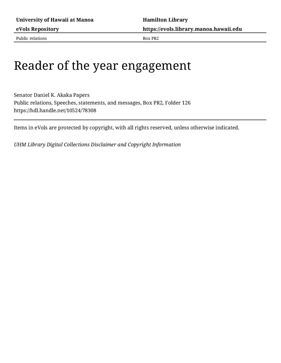 Reader of the year engagement, April 9, 1987, MANUSCRIPT-HCPC00010, Public relations, Speeches, statements, and messages, Box PR2, Folder 126, Senator Daniel K. Akaka Papers, Hawaiʻi Congressional Papers Collection, University of Hawaiʻi at Mānoa Library, Honolulu, HI. https://omekas-congress.lib.wvu.edu/catalog/10524_78308 (accessed April 20, 2026).