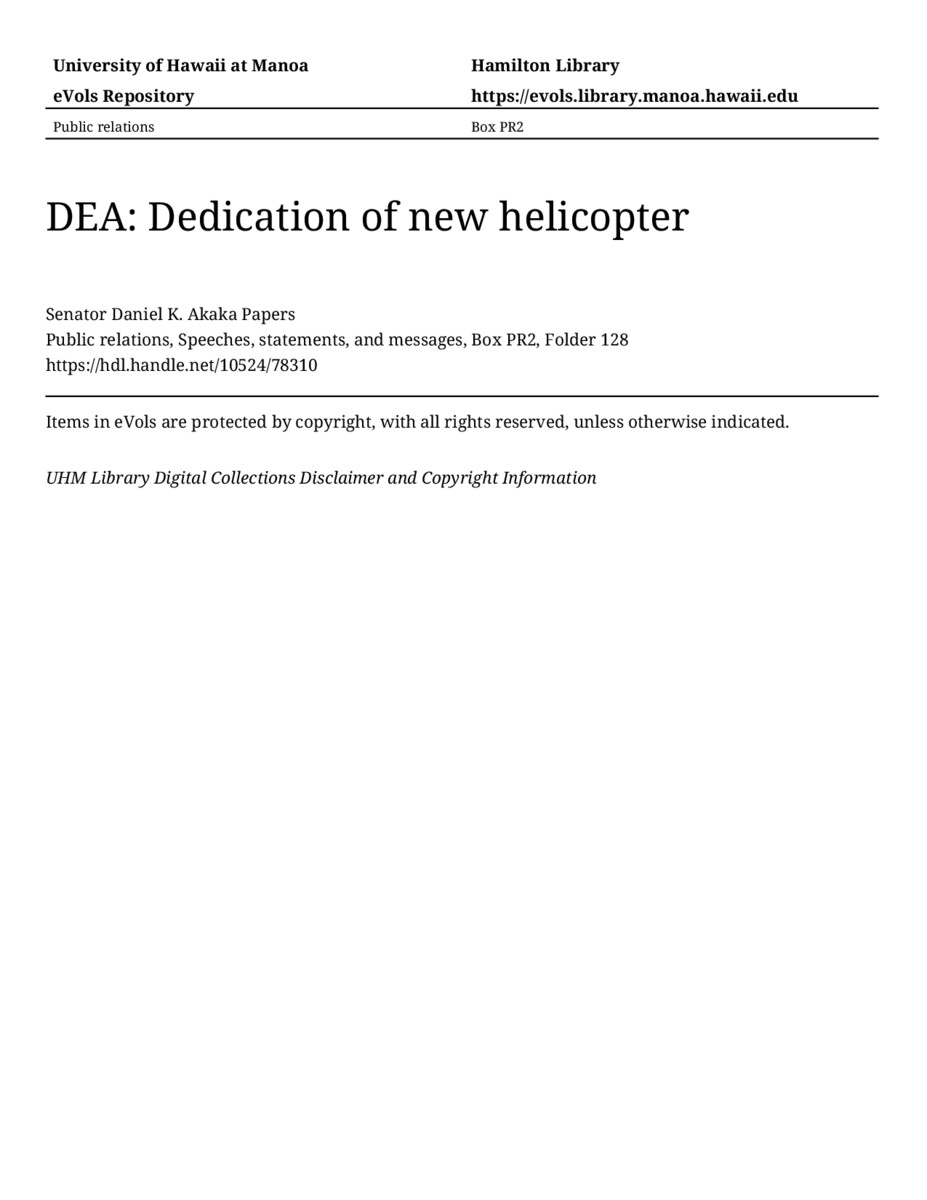 DEA: Dedication of new helicopter, April 13, 1987, MANUSCRIPT-HCPC00010, Public relations, Speeches, statements, and messages, Box PR2, Folder 128, Senator Daniel K. Akaka Papers, Hawaiʻi Congressional Papers Collection, University of Hawaiʻi at Mānoa Library, Honolulu, HI. https://omekas-congress.lib.wvu.edu/catalog/10524_78310 (accessed April 20, 2026).