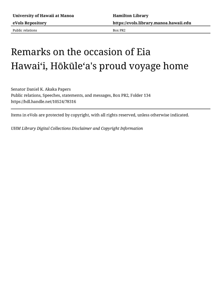 - Remarks on the occasion of Eia Hawaiʻi, Hōkūleʻa's proud voyage home