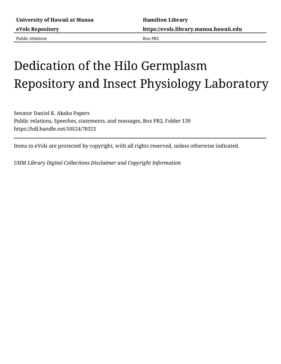 - Dedication of the Hilo Germplasm Repository and Insect Physiology Laboratory