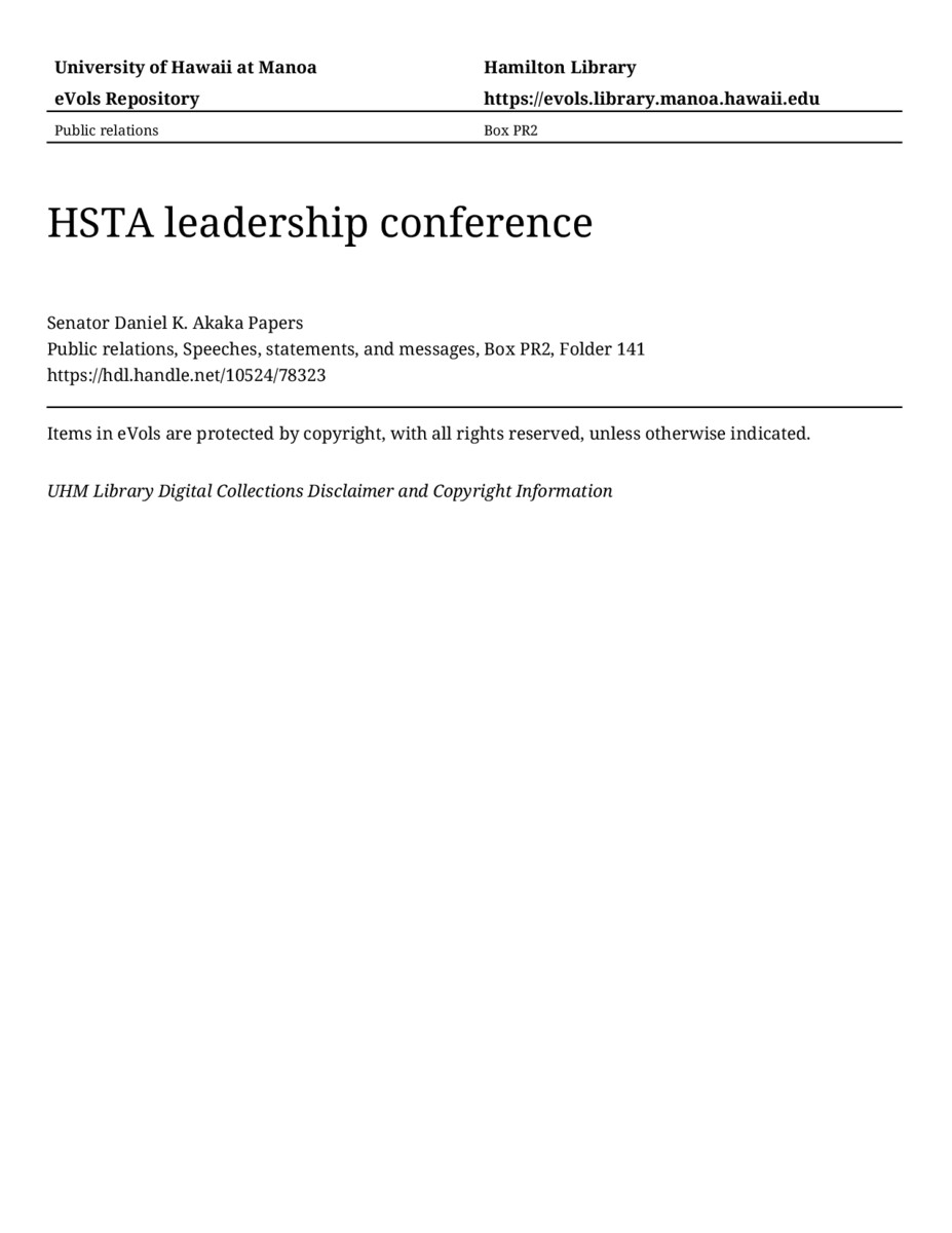 HSTA leadership conference, August 19, 1987, MANUSCRIPT-HCPC00010, Public relations, Speeches, statements, and messages, Box PR2, Folder 141, Senator Daniel K. Akaka Papers, Hawaiʻi Congressional Papers Collection, University of Hawaiʻi at Mānoa Library, Honolulu, HI. https://omekas-congress.lib.wvu.edu/catalog/10524_78323 (accessed April 19, 2026).
