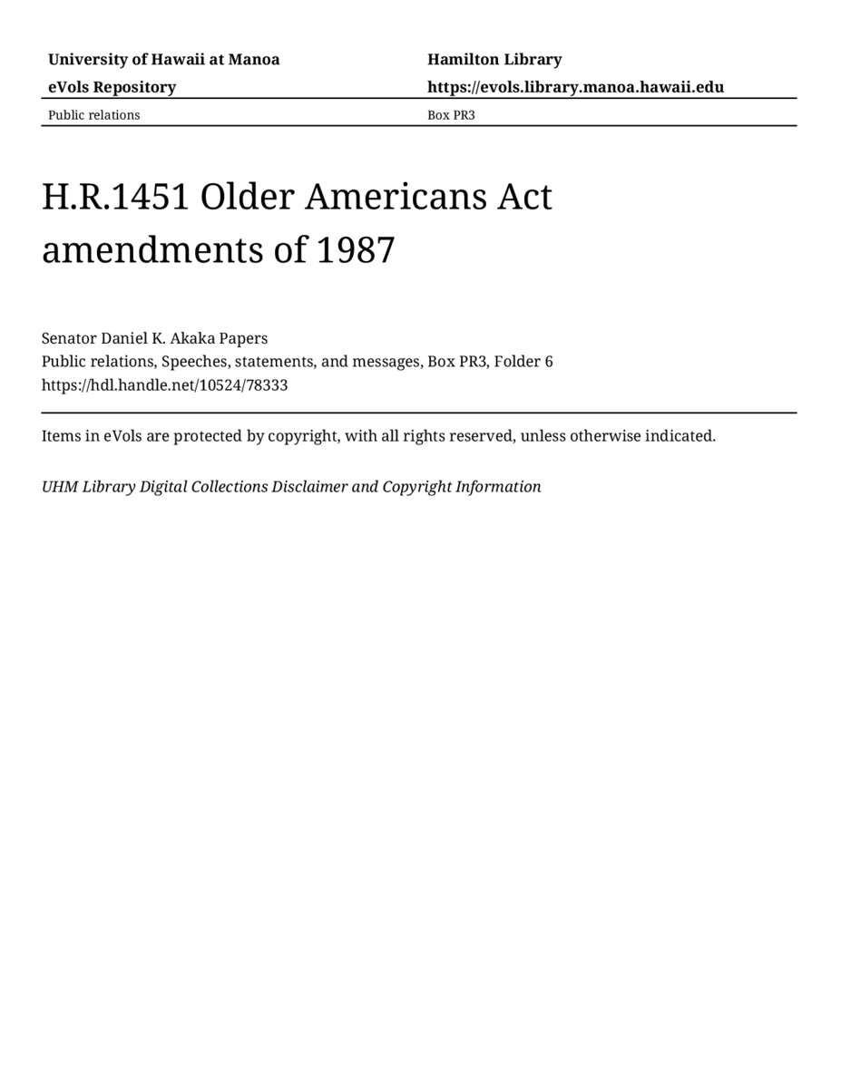 H.R.1451 Older Americans Act amendments of 1987, November 17, 1987, MANUSCRIPT-HCPC00010, Public relations, Speeches, statements, and messages, Box PR3, Folder 6, Senator Daniel K. Akaka Papers, Hawaiʻi Congressional Papers Collection, University of Hawaiʻi at Mānoa Library, Honolulu, HI. https://omekas-congress.lib.wvu.edu/catalog/10524_78333 (accessed April 19, 2026).