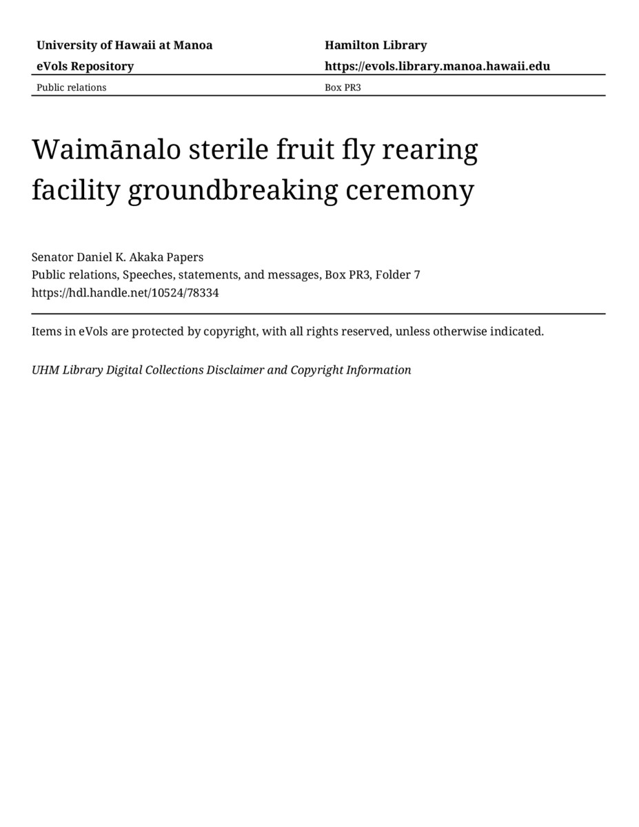 - Waimānalo sterile fruit fly rearing facility groundbreaking ceremony