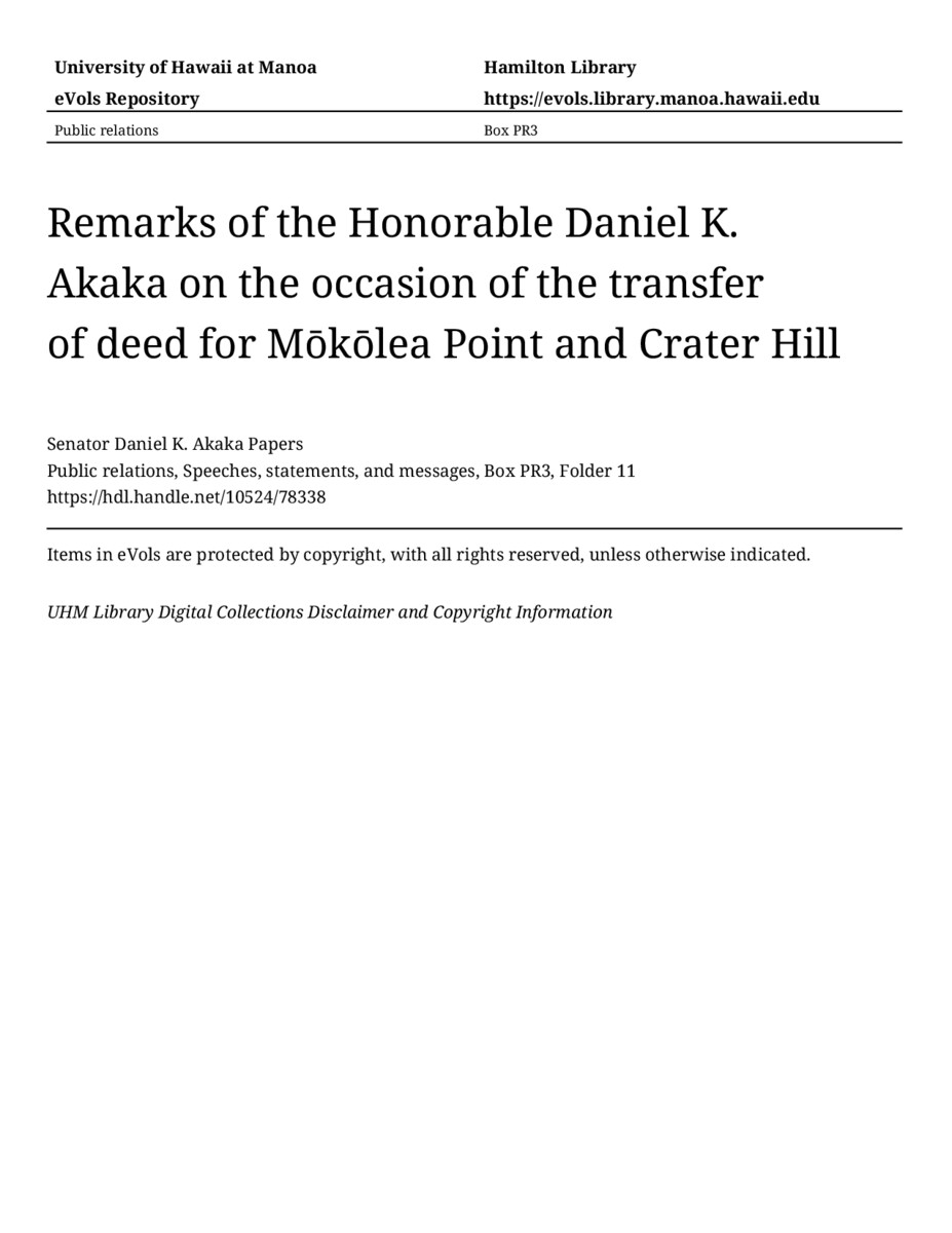 Remarks of the Honorable Daniel K. Akaka on the occasion of the transfer of deed for Mōkōlea Point and Crater Hill, March 8, 1988, MANUSCRIPT-HCPC00010, Public relations, Speeches, statements, and messages, Box PR3, Folder 11, Senator Daniel K. Akaka Papers, Hawaiʻi Congressional Papers Collection, University of Hawaiʻi at Mānoa Library, Honolulu, HI. https://omekas-congress.lib.wvu.edu/catalog/10524_78338 (accessed April 19, 2026).