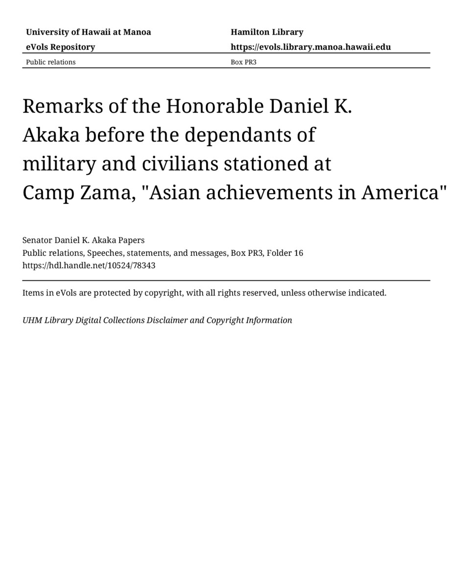 Remarks of the Honorable Daniel K. Akaka before the dependants of military and civilians stationed at Camp Zama, "Asian achievements in America", May 19, 1988, MANUSCRIPT-HCPC00010, Public relations, Speeches, statements, and messages, Box PR3, Folder 16, Senator Daniel K. Akaka Papers, Hawaiʻi Congressional Papers Collection, University of Hawaiʻi at Mānoa Library, Honolulu, HI. https://omekas-congress.lib.wvu.edu/catalog/10524_78343 (accessed April 18, 2026).