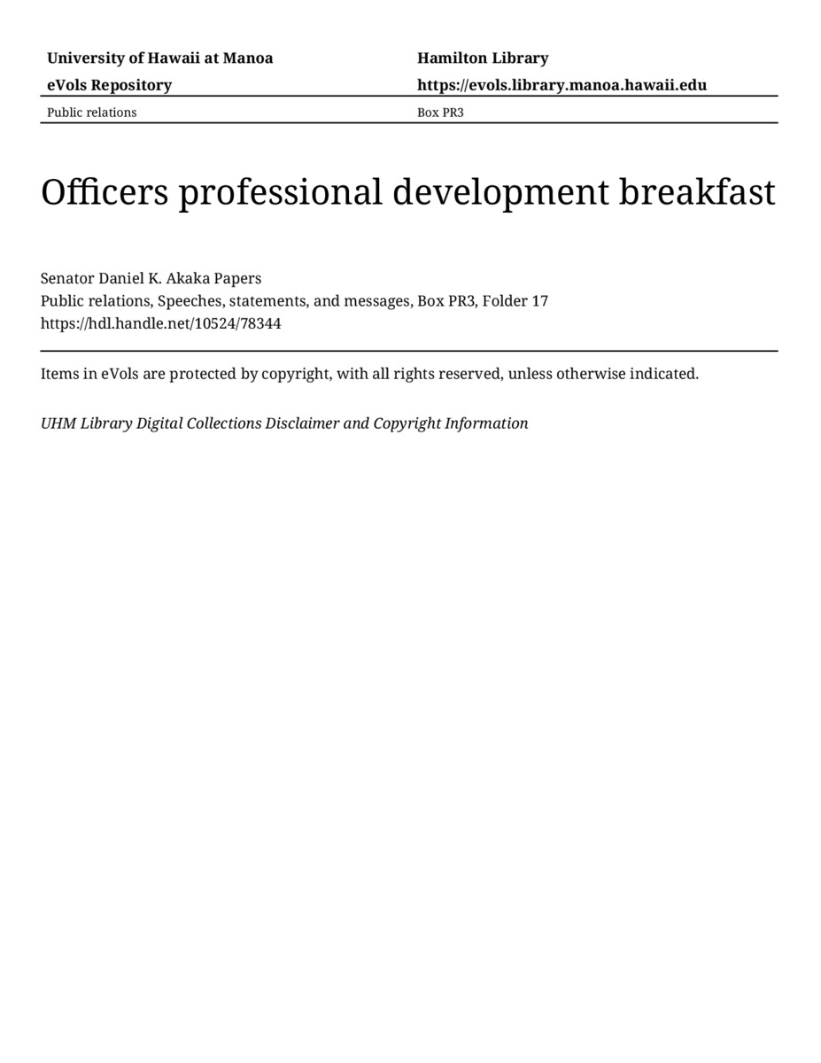 Officers professional development breakfast, May 20, 1988, MANUSCRIPT-HCPC00010, Public relations, Speeches, statements, and messages, Box PR3, Folder 17, Senator Daniel K. Akaka Papers, Hawaiʻi Congressional Papers Collection, University of Hawaiʻi at Mānoa Library, Honolulu, HI. https://omekas-congress.lib.wvu.edu/catalog/10524_78344 (accessed April 18, 2026).
