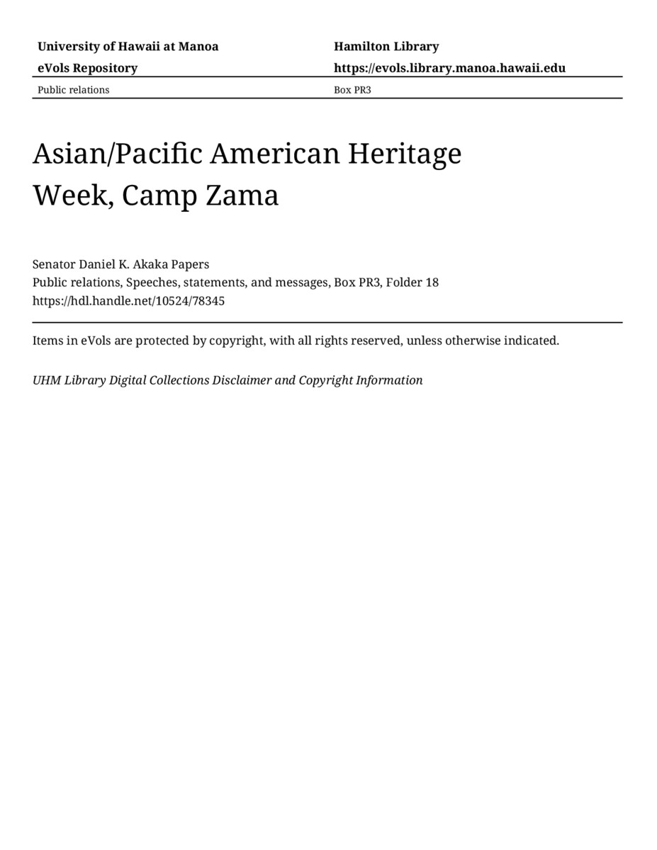 Asian/Pacific American Heritage Week, Camp Zama, May 20, 1988, MANUSCRIPT-HCPC00010, Public relations, Speeches, statements, and messages, Box PR3, Folder 18, Senator Daniel K. Akaka Papers, Hawaiʻi Congressional Papers Collection, University of Hawaiʻi at Mānoa Library, Honolulu, HI. https://omekas-congress.lib.wvu.edu/catalog/10524_78345 (accessed April 18, 2026).