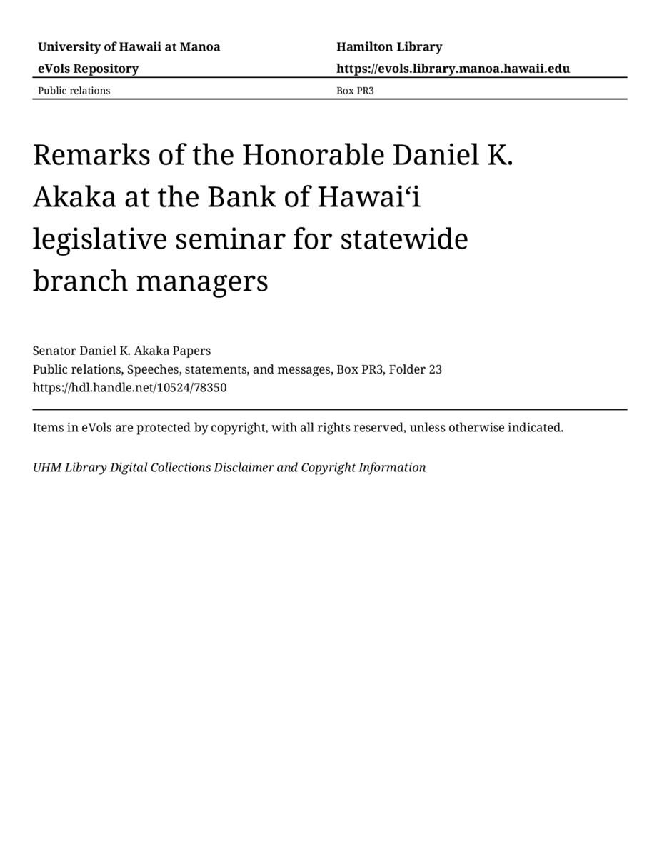 Remarks of the Honorable Daniel K. Akaka at the Bank of Hawaiʻi legislative seminar for statewide branch managers, June 4, 1988, MANUSCRIPT-HCPC00010, Public relations, Speeches, statements, and messages, Box PR3, Folder 23, Senator Daniel K. Akaka Papers, Hawaiʻi Congressional Papers Collection, University of Hawaiʻi at Mānoa Library, Honolulu, HI. https://omekas-congress.lib.wvu.edu/catalog/10524_78350 (accessed April 18, 2026).