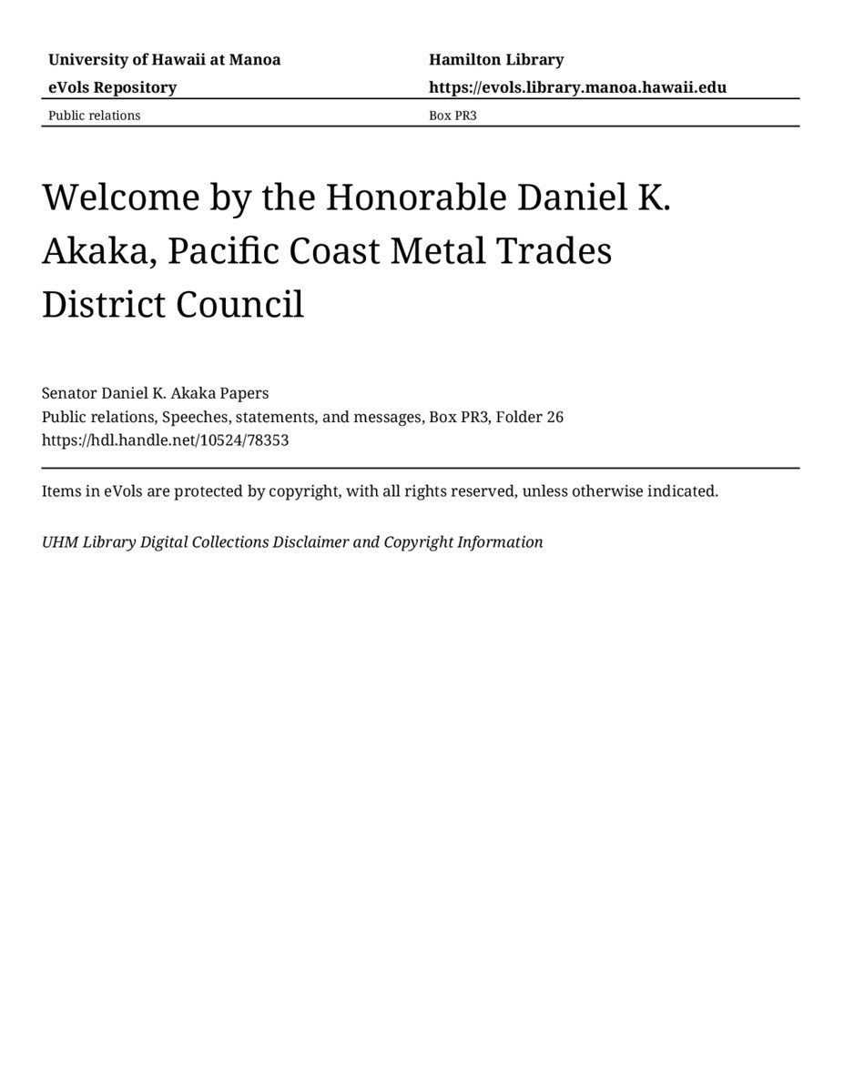 - Welcome by the Honorable Daniel K. Akaka, Pacific Coast Metal Trades District Council
