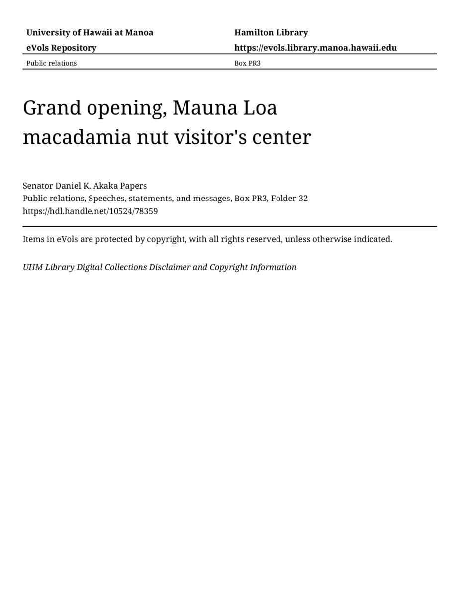 Grand opening, Mauna Loa macadamia nut visitor's center, August 12, 1988, MANUSCRIPT-HCPC00010, Public relations, Speeches, statements, and messages, Box PR3, Folder 32, Senator Daniel K. Akaka Papers, Hawaiʻi Congressional Papers Collection, University of Hawaiʻi at Mānoa Library, Honolulu, HI. https://omekas-congress.lib.wvu.edu/catalog/10524_78359 (accessed April 19, 2026).