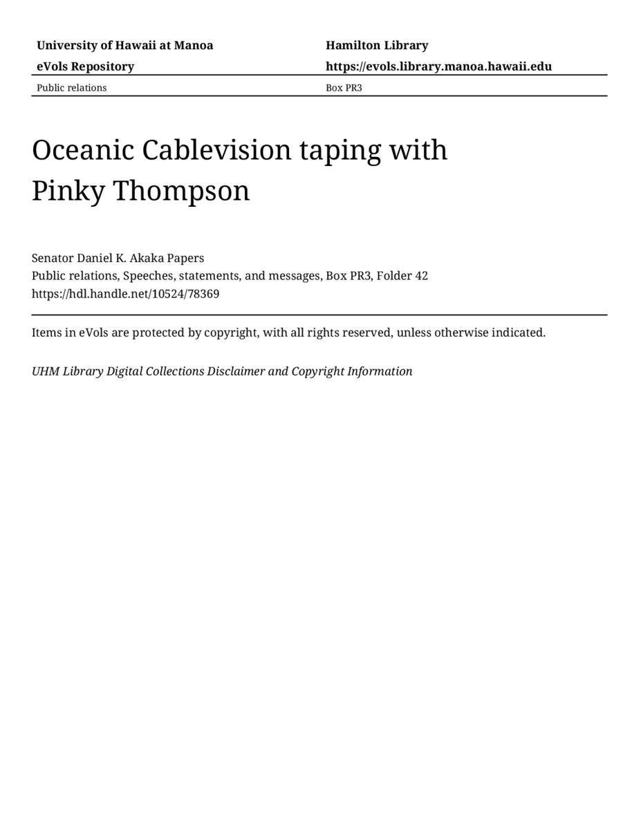 Oceanic Cablevision taping with Pinky Thompson, approximately 1988, MANUSCRIPT-HCPC00010, Public relations, Speeches, statements, and messages, Box PR3, Folder 42, Senator Daniel K. Akaka Papers, Hawaiʻi Congressional Papers Collection, University of Hawaiʻi at Mānoa Library, Honolulu, HI. https://omekas-congress.lib.wvu.edu/catalog/10524_78369 (accessed April 20, 2026).