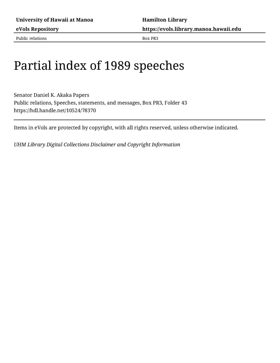 Partial index of 1989 speeches, December 8, 1988-December 13, 1988, MANUSCRIPT-HCPC00010, Public relations, Speeches, statements, and messages, Box PR3, Folder 43, Senator Daniel K. Akaka Papers, Hawaiʻi Congressional Papers Collection, University of Hawaiʻi at Mānoa Library, Honolulu, HI. https://omekas-congress.lib.wvu.edu/catalog/10524_78370 (accessed April 15, 2026).