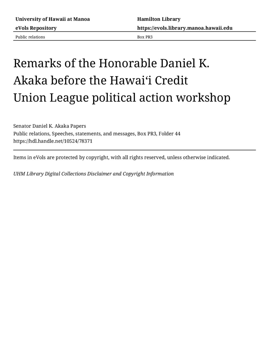Remarks of the Honorable Daniel K. Akaka before the Hawaiʻi Credit Union League political action workshop, January 12, 1989, MANUSCRIPT-HCPC00010, Public relations, Speeches, statements, and messages, Box PR3, Folder 44, Senator Daniel K. Akaka Papers, Hawaiʻi Congressional Papers Collection, University of Hawaiʻi at Mānoa Library, Honolulu, HI. https://omekas-congress.lib.wvu.edu/catalog/10524_78371 (accessed April 15, 2026).