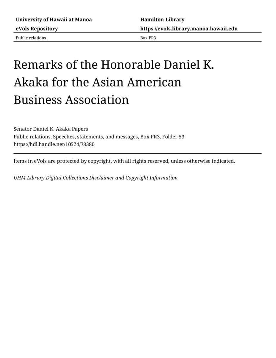 - Remarks of the Honorable Daniel K. Akaka for the Asian American Business Association