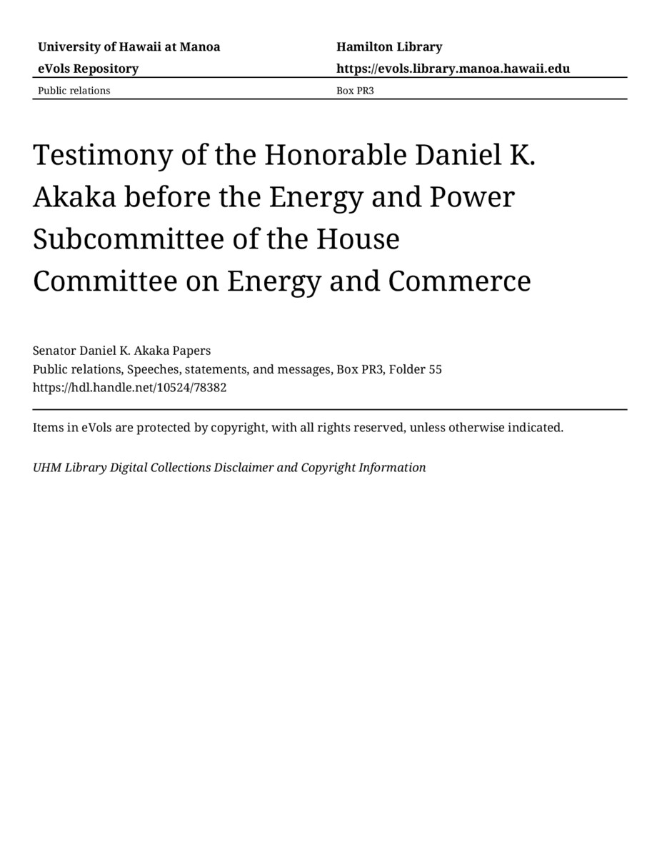 Testimony of the Honorable Daniel K. Akaka before the Energy and Power Subcommittee of the House Committee on Energy and Commerce, April 19, 1989, MANUSCRIPT-HCPC00010, Public relations, Speeches, statements, and messages, Box PR3, Folder 55, Senator Daniel K. Akaka Papers, Hawaiʻi Congressional Papers Collection, University of Hawaiʻi at Mānoa Library, Honolulu, HI. https://omekas-congress.lib.wvu.edu/catalog/10524_78382 (accessed April 17, 2026).