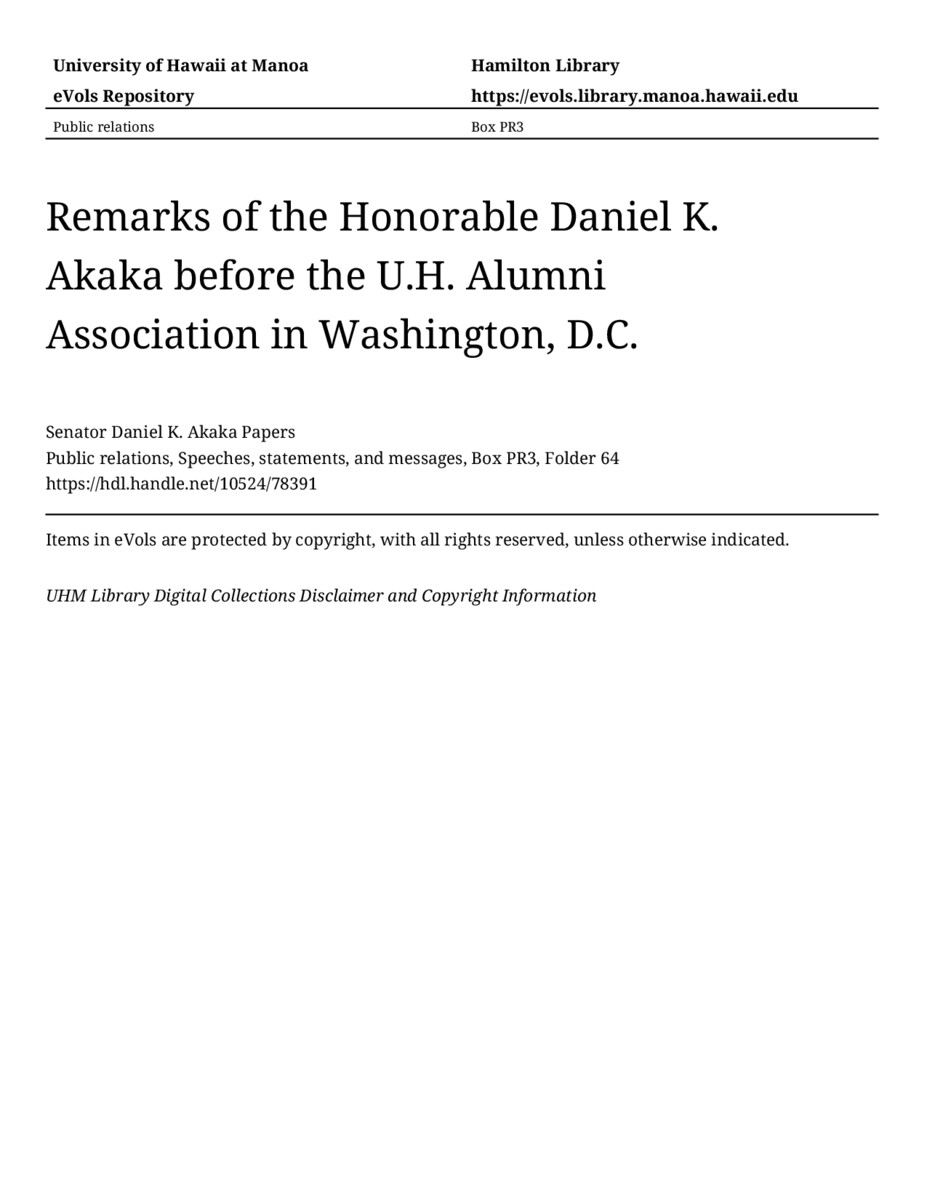 - Remarks of the Honorable Daniel K. Akaka before the U.H. Alumni Association in Washington, D.C.