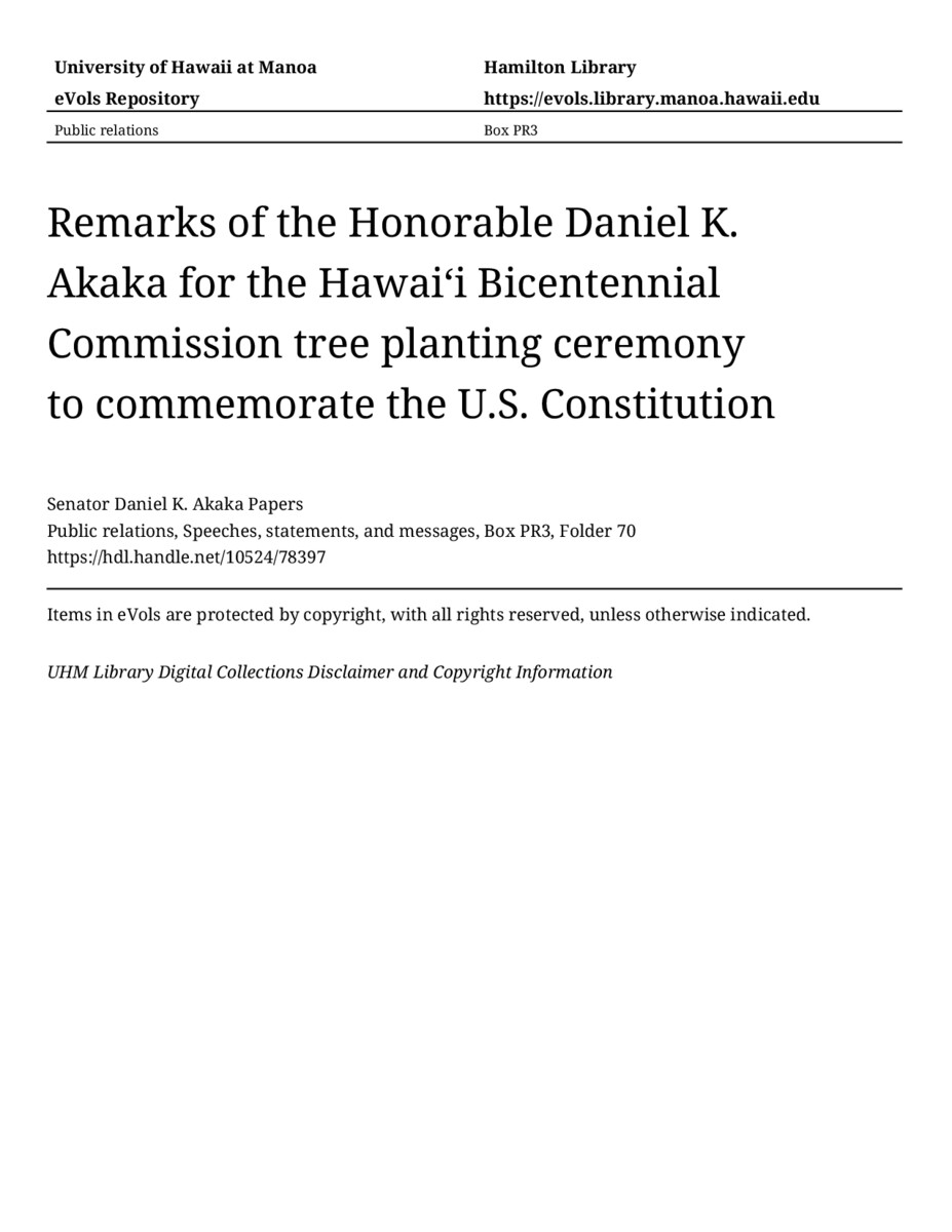 Remarks of the Honorable Daniel K. Akaka for the Hawaiʻi Bicentennial Commission tree planting ceremony to commemorate the U.S. Constitution, August 16, 1989, MANUSCRIPT-HCPC00010, Public relations, Speeches, statements, and messages, Box PR3, Folder 70, Senator Daniel K. Akaka Papers, Hawaiʻi Congressional Papers Collection, University of Hawaiʻi at Mānoa Library, Honolulu, HI. https://omekas-congress.lib.wvu.edu/catalog/10524_78397 (accessed April 21, 2026).
